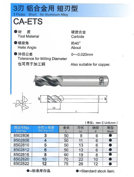 CA-ETS铝用短刃3刃端铣刀